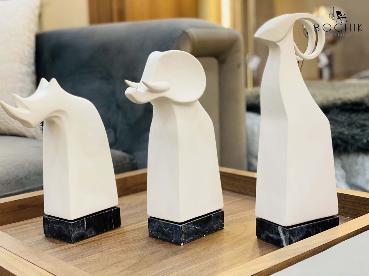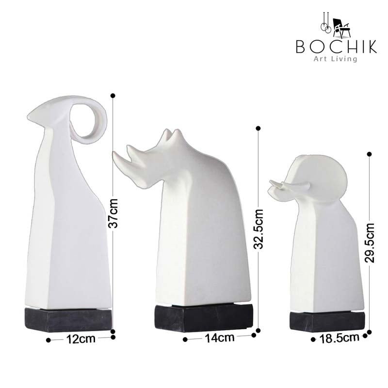 Trio de Statuettes d’animaux en céramique blanche avec support en noir