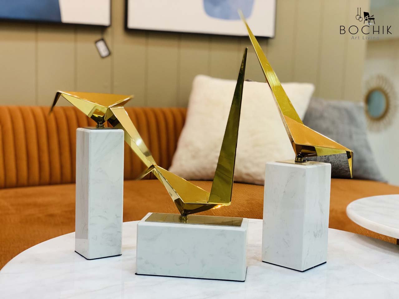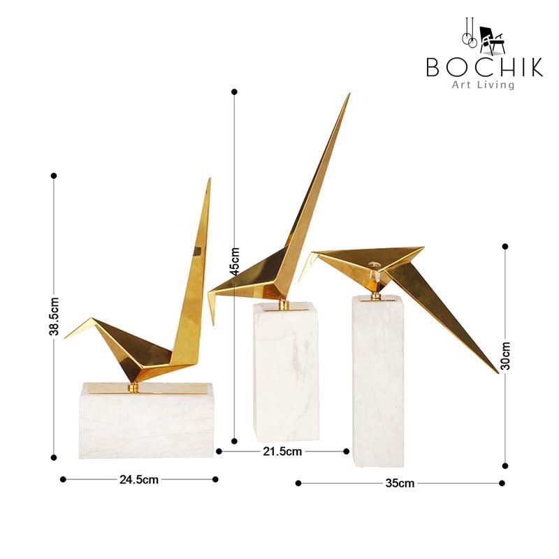 Trio de décoration d’oiseaux en acier inoxydable Or et support en Marbre Naturel Couleur Blanche