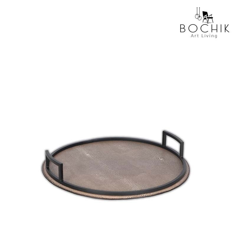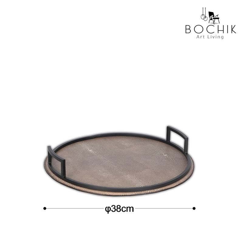 Plateau rond en métal noir et cuir couleur Marron