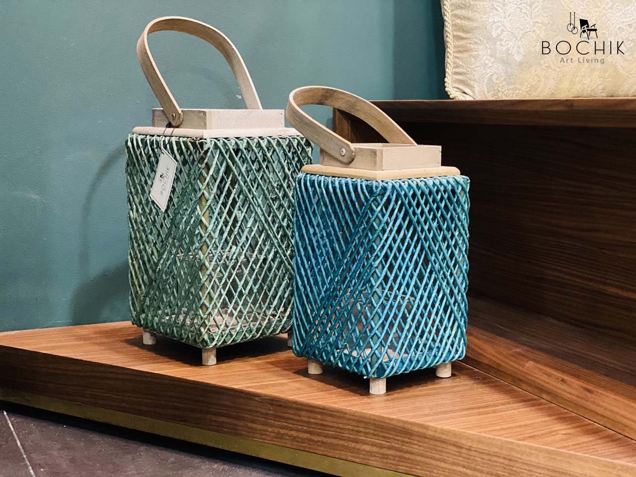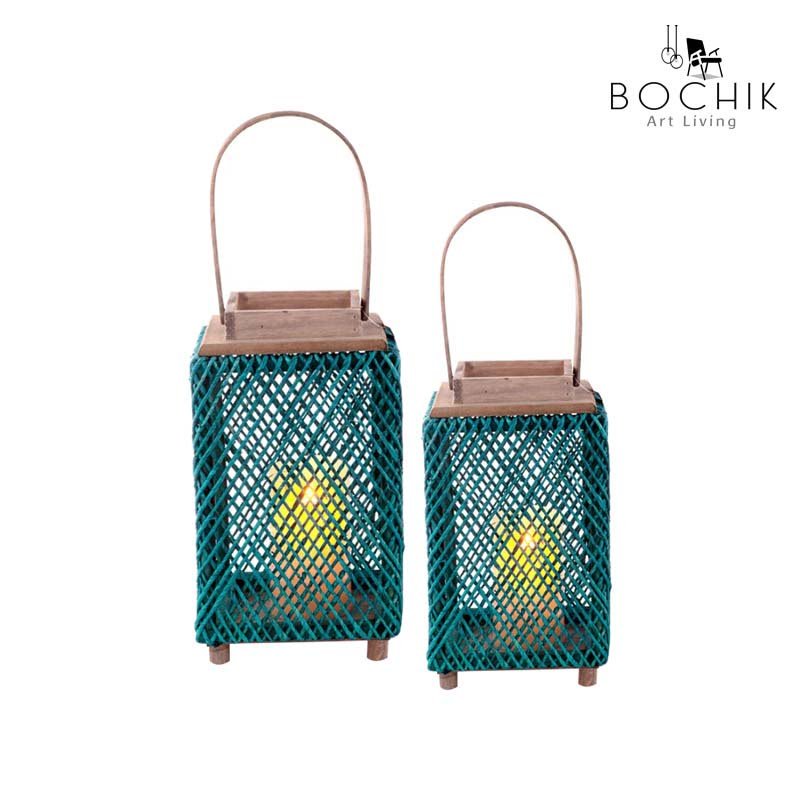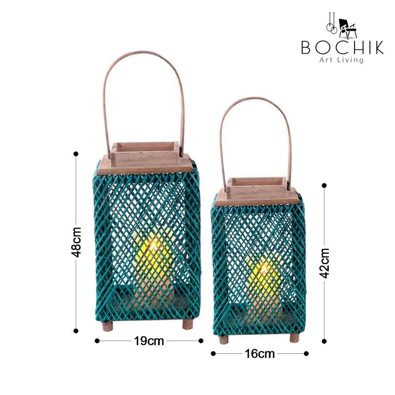 Duo de Lanternes de forme cubique en Laine couleur bleu turquois et bois
