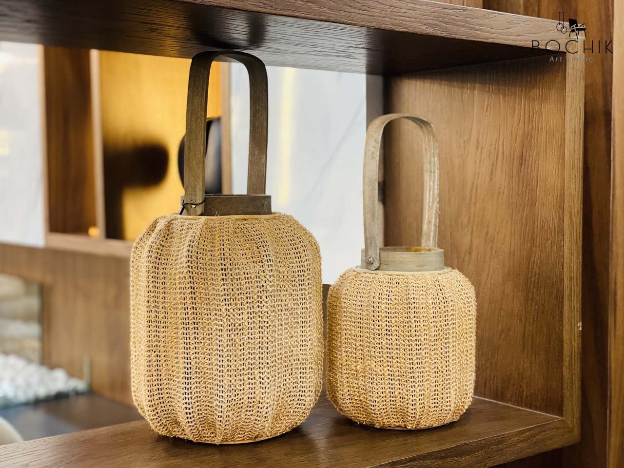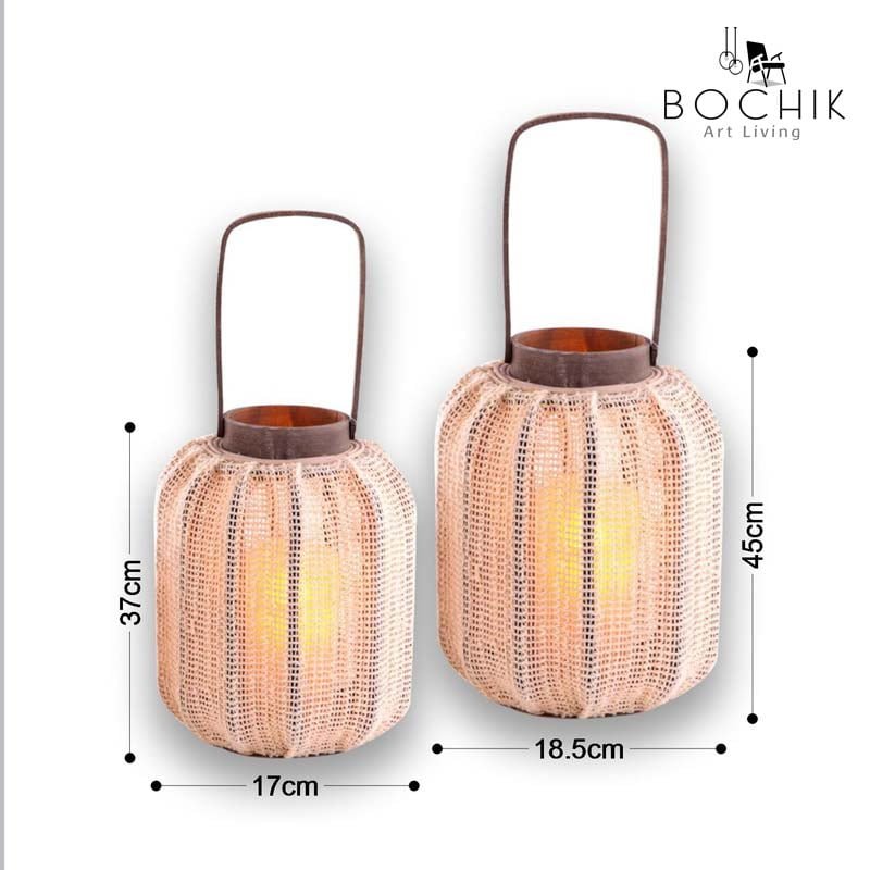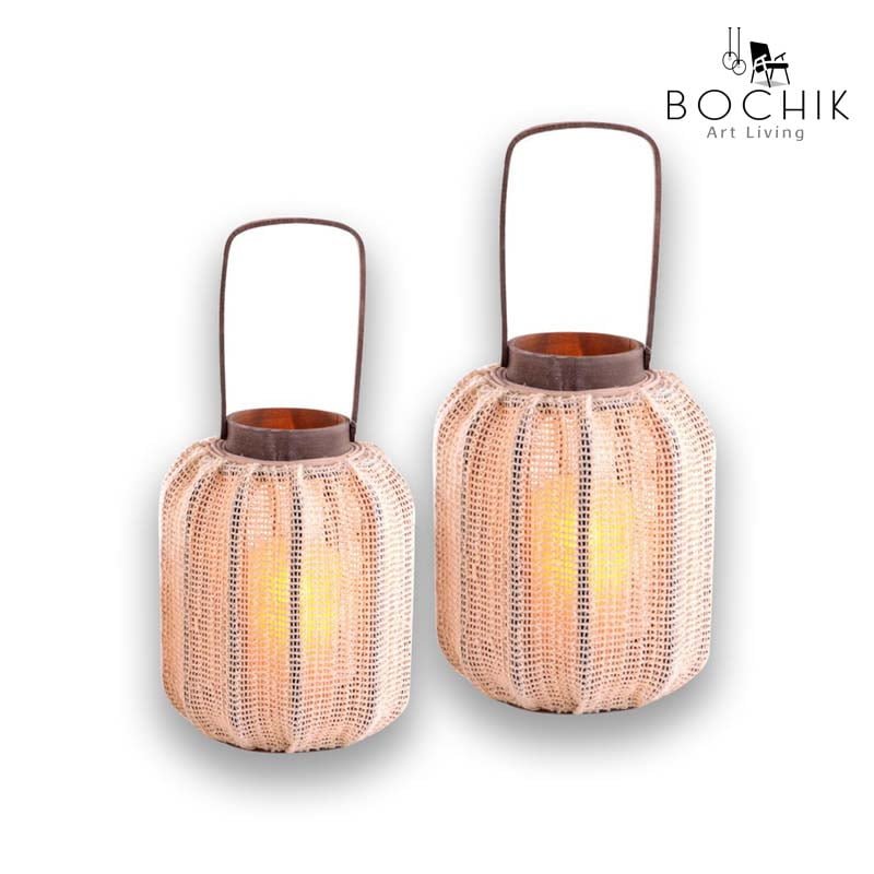 Duo de Lanternes de forme cylindrique en Laine couleur taupe et bois