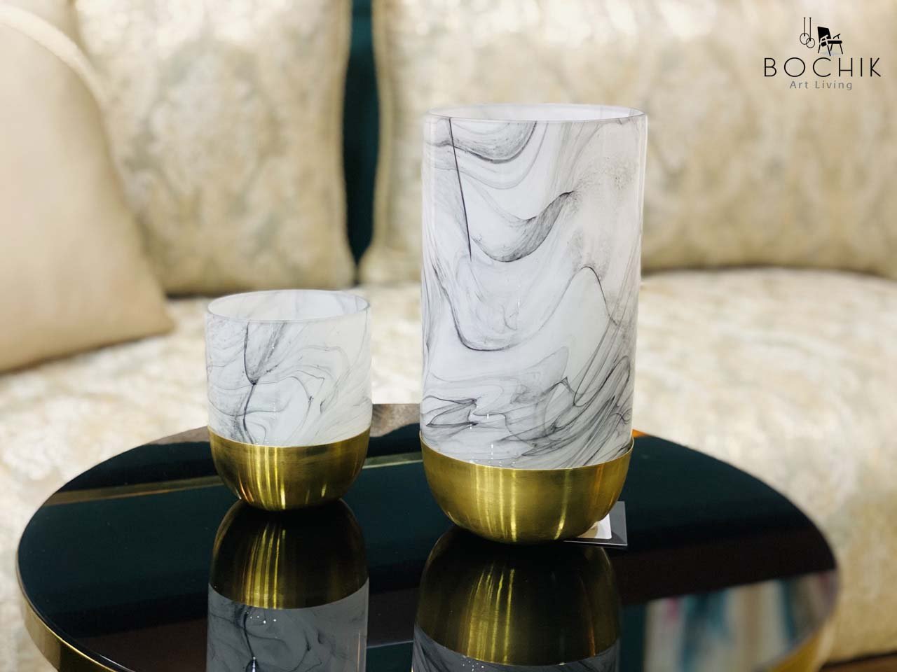 Duo de vases chic et design en céramique blanc et noir et laiton