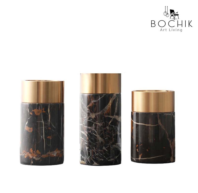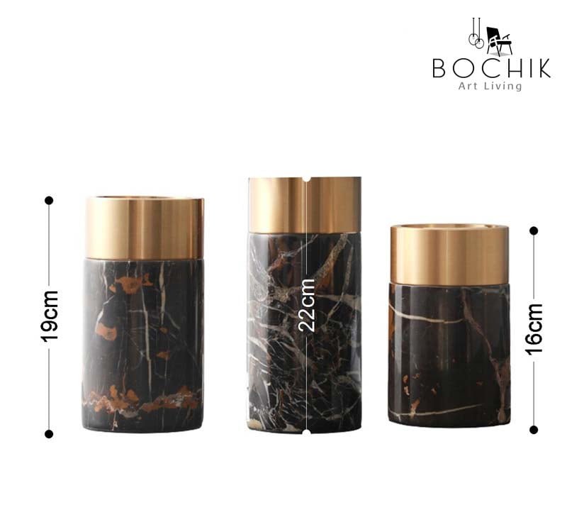 Trio de vases en cylindre en Marbre Naturel couleur Noire et contour en Acier inoxydable couleur Or