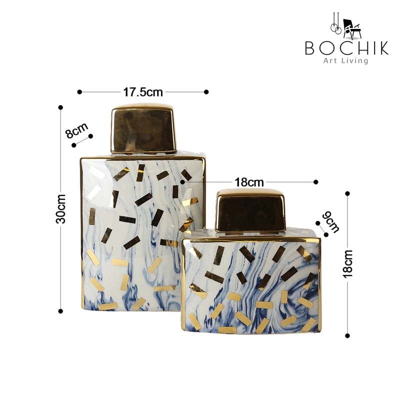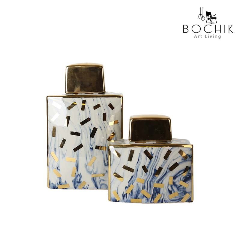 Duo de Vases en céramique peints en bleu et doré, couvercle en Céramique doré