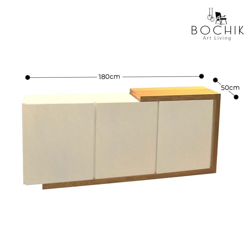 Buffet moderne en laqué blanc avec trois portes et étagère de rangement, contour en bois chêne naturel.