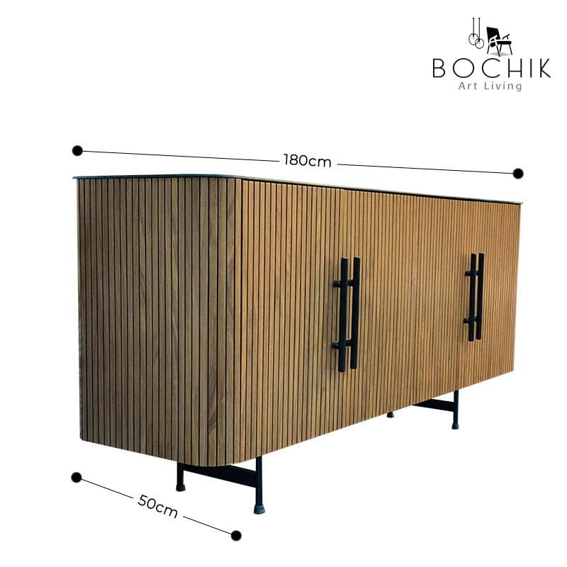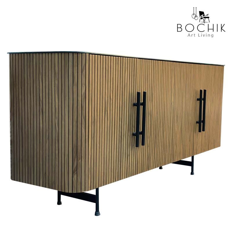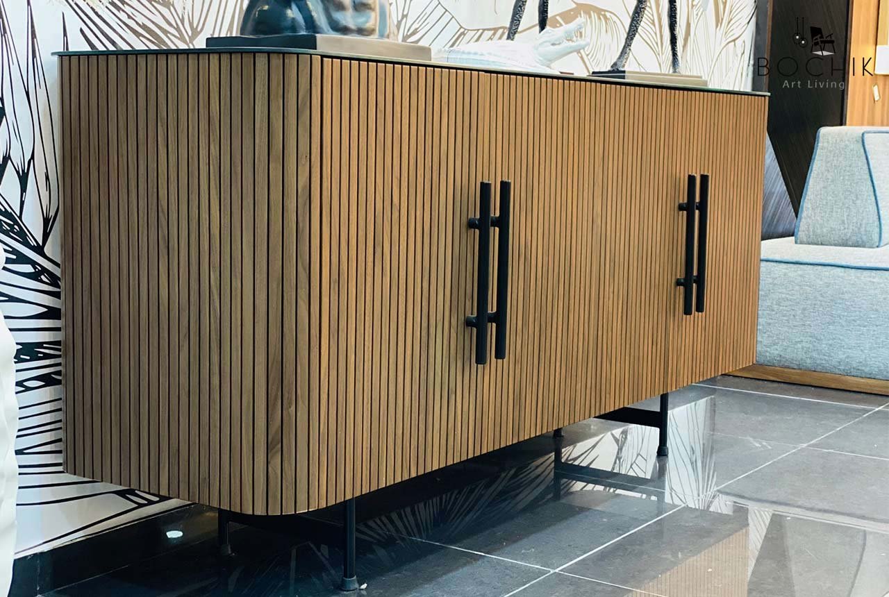 Buffet design en bardage bois noyer, socle et poignées en métal laqué noir et plateau en verre teinté noir.