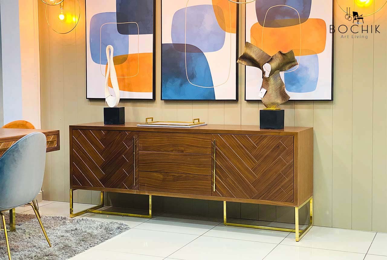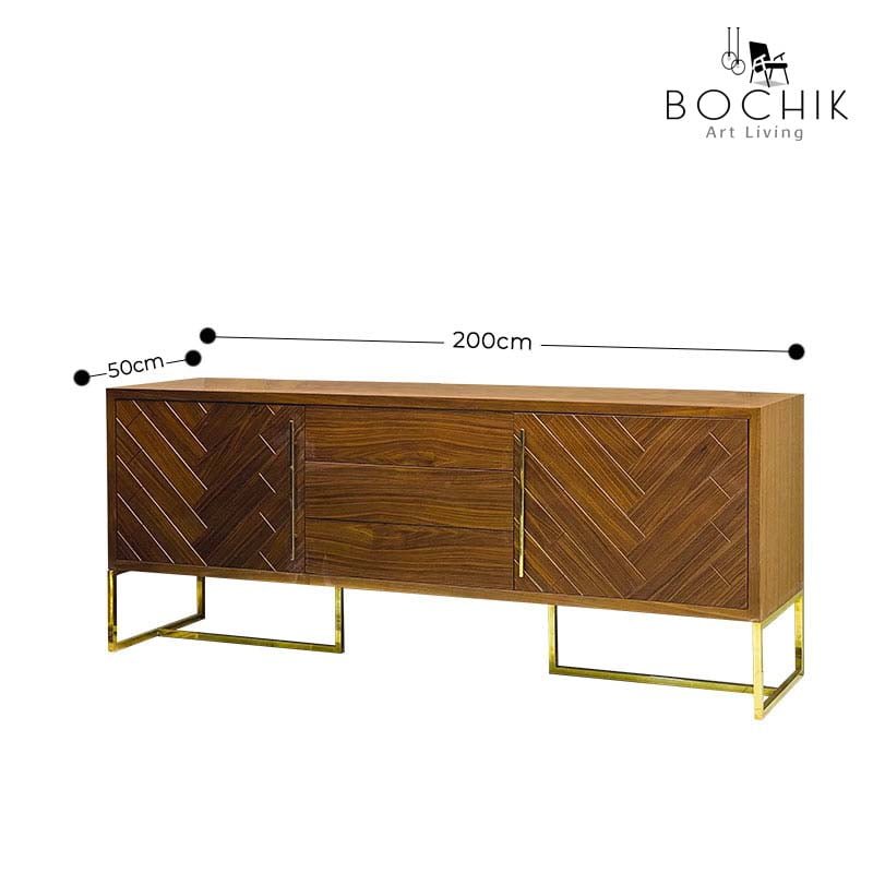 Buffet élégant en bois noyer avec 2 portes et 3 tiroirs socle et poignées en Laiton véritable.