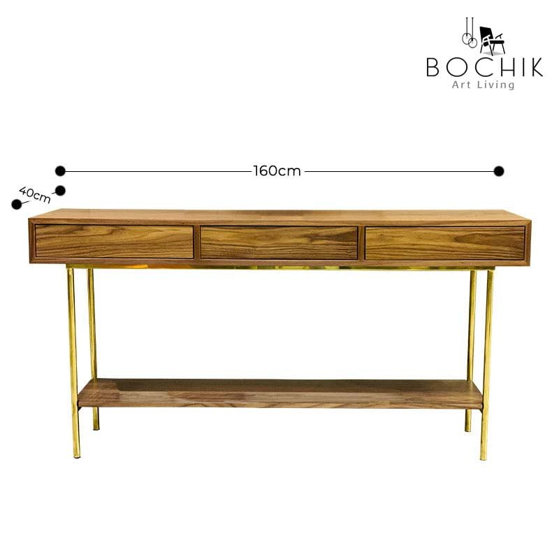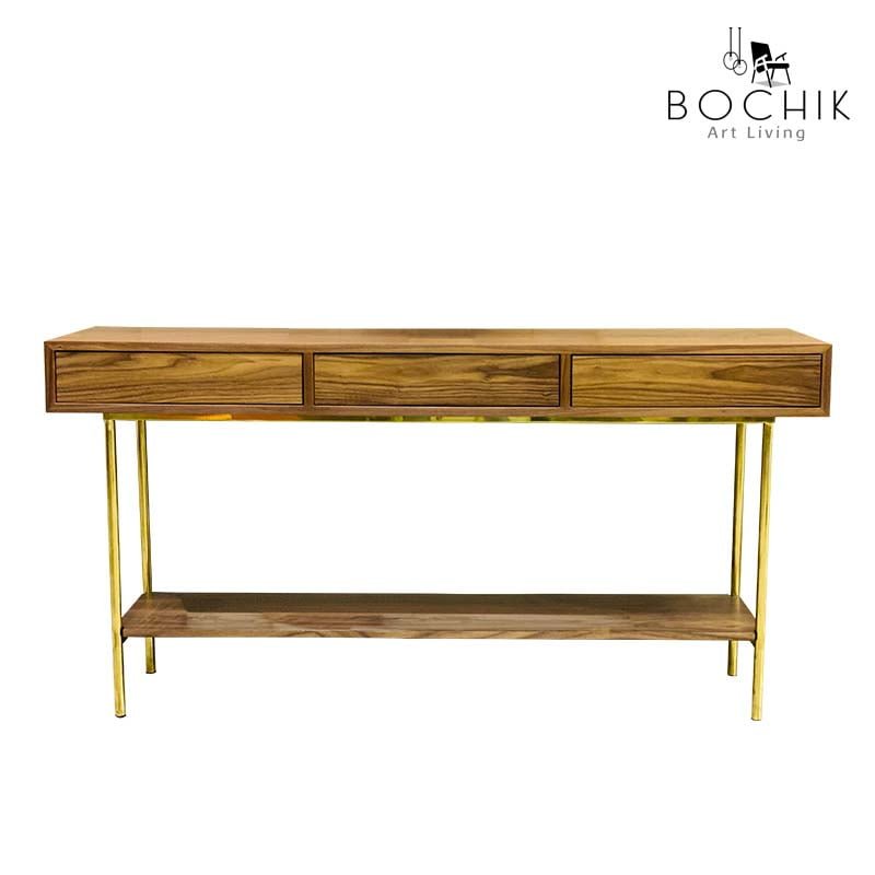 Console en bois noyer avec 3 tiroirs et étagère avec piètement et poignées en laiton véritable.