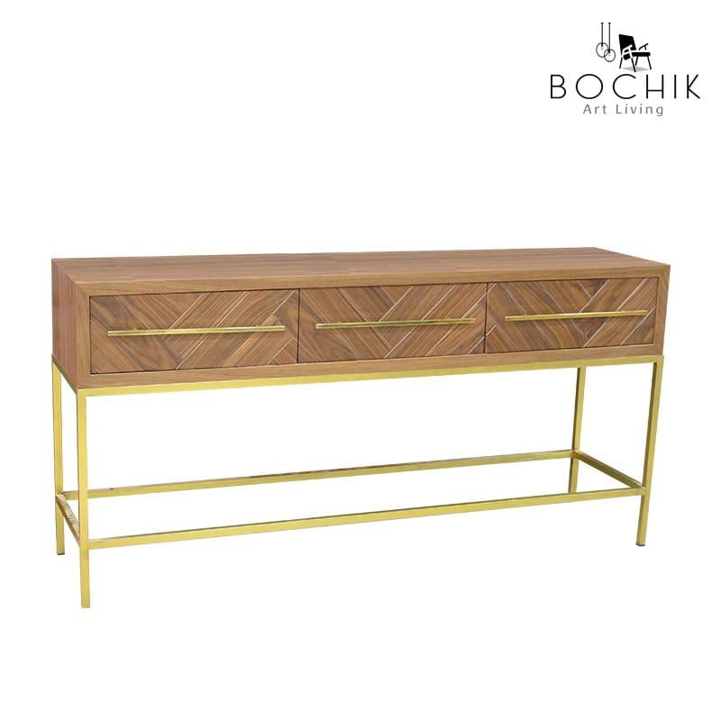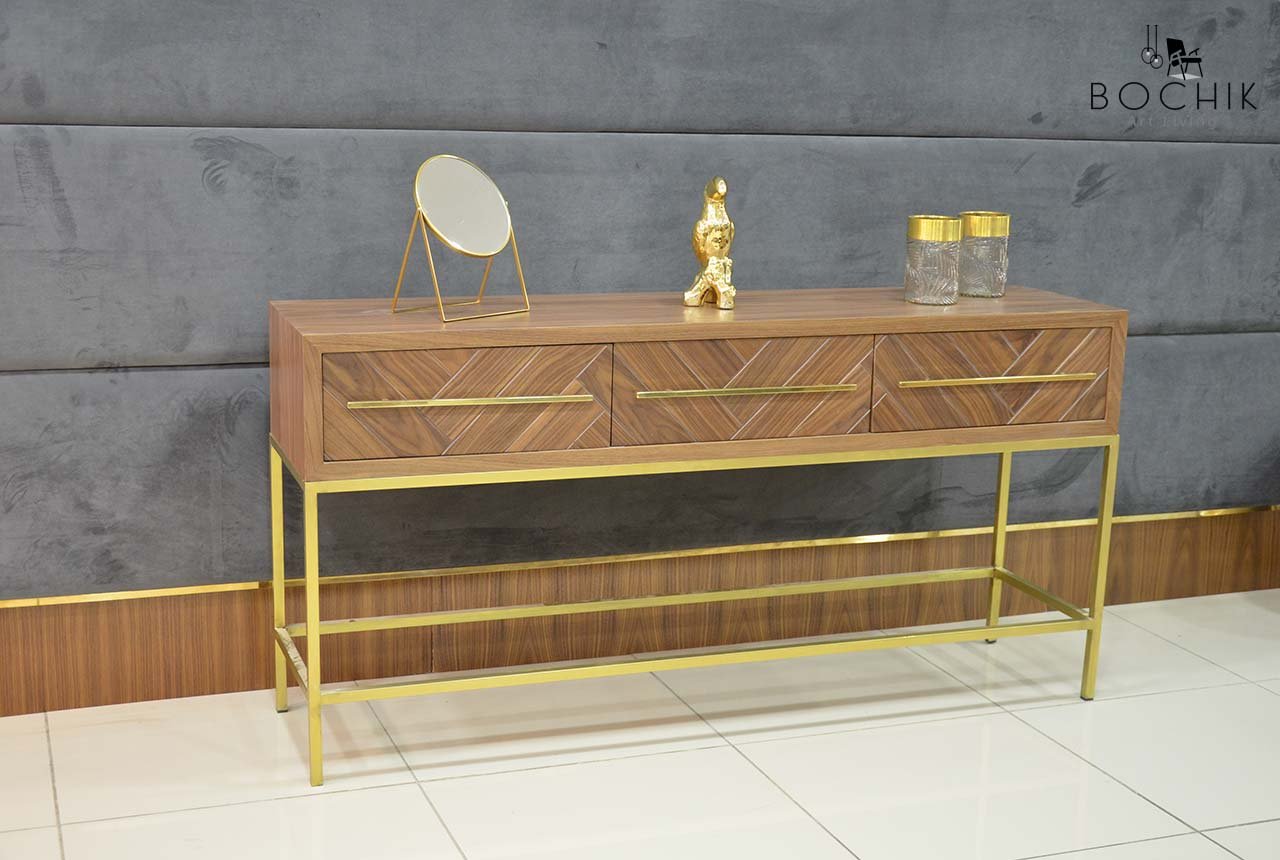 Console luxueuse en bois noyer avec 3 tiroirs effet chevrons, piètement et poignées en laiton véritable.
