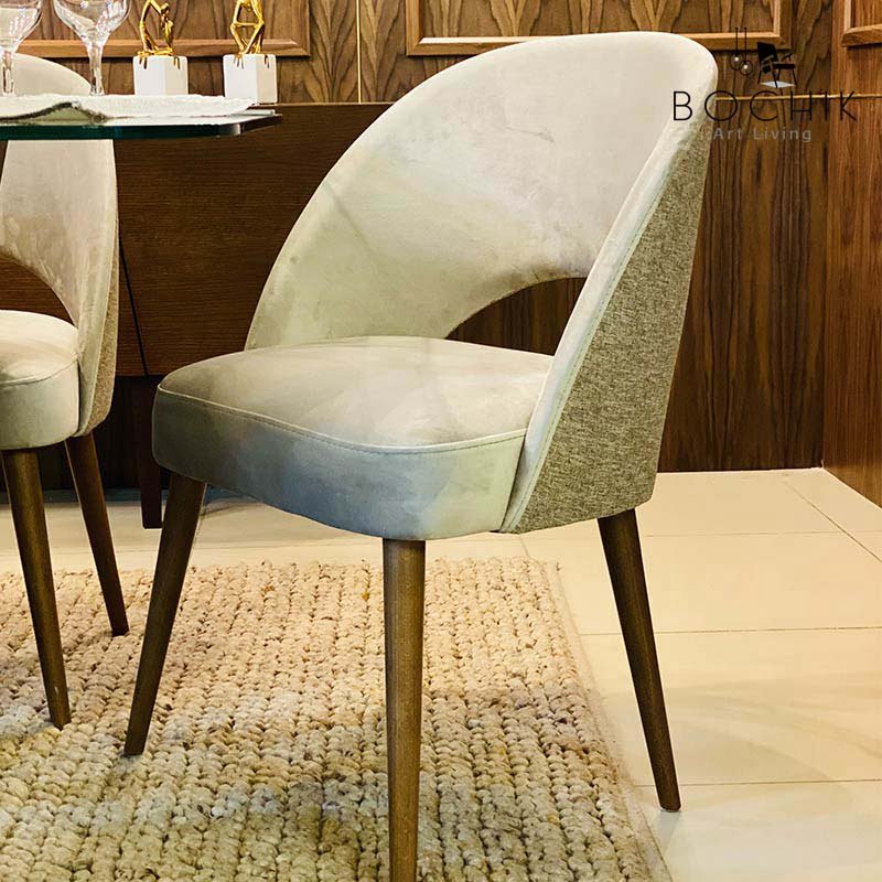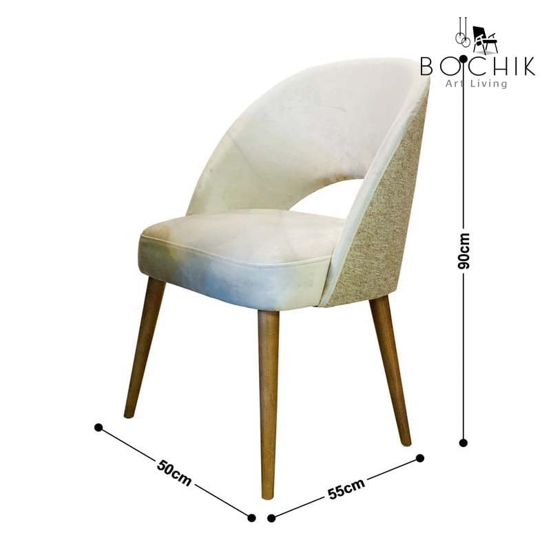 Chaise design en toile et velours avec piétement en bois hêtre massif vernis noyer, idéal pour salle à manger