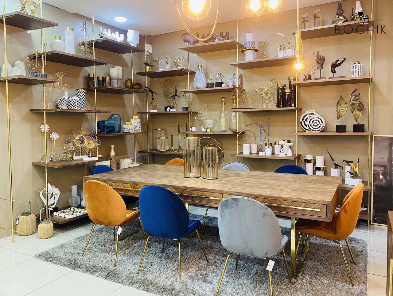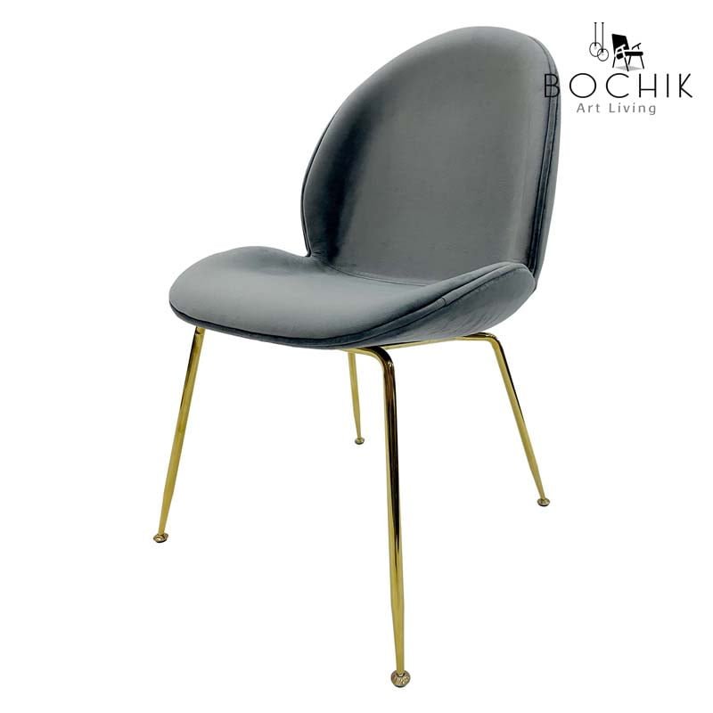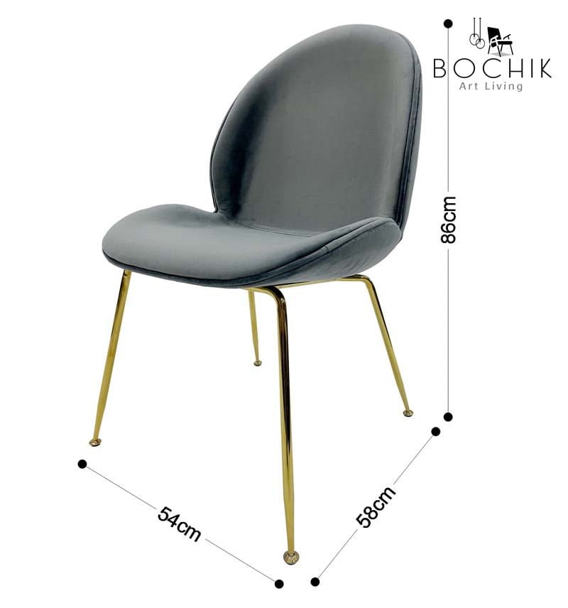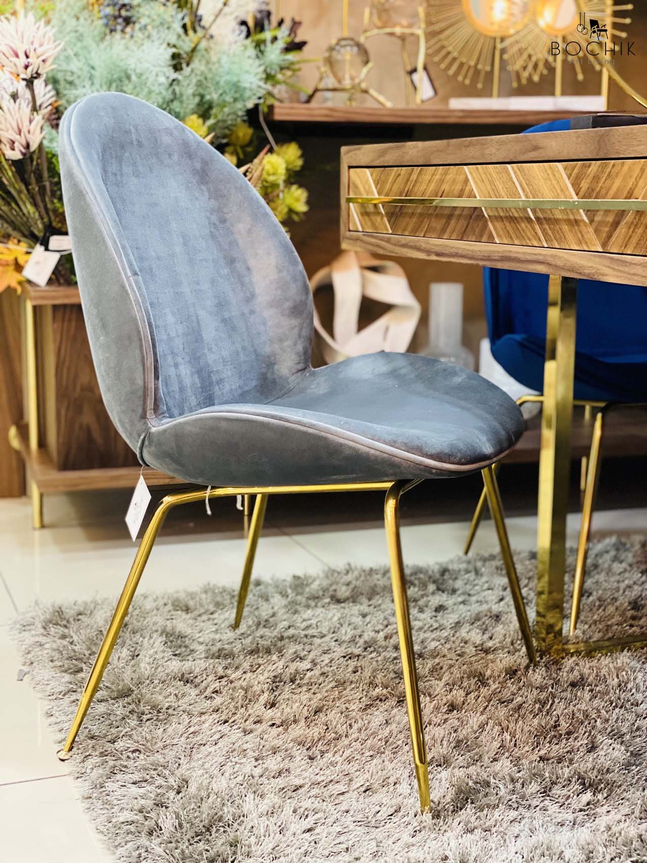 Chaise design en velours avec piètement en Acier Inoxydable Couleur Or. Disponible en 3 Couleurs (Taupe, bleu & orange).