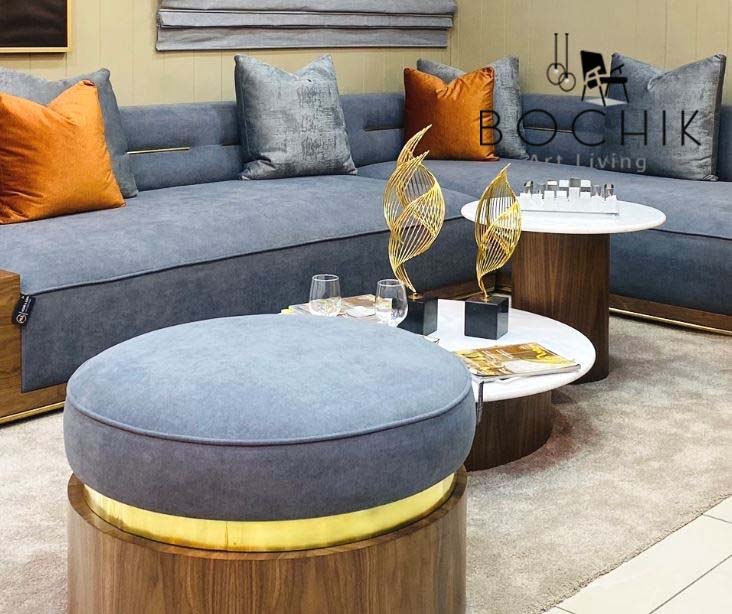 Tabouret chic en bois noyer et assise en toile crise avec bande en laiton véritable.