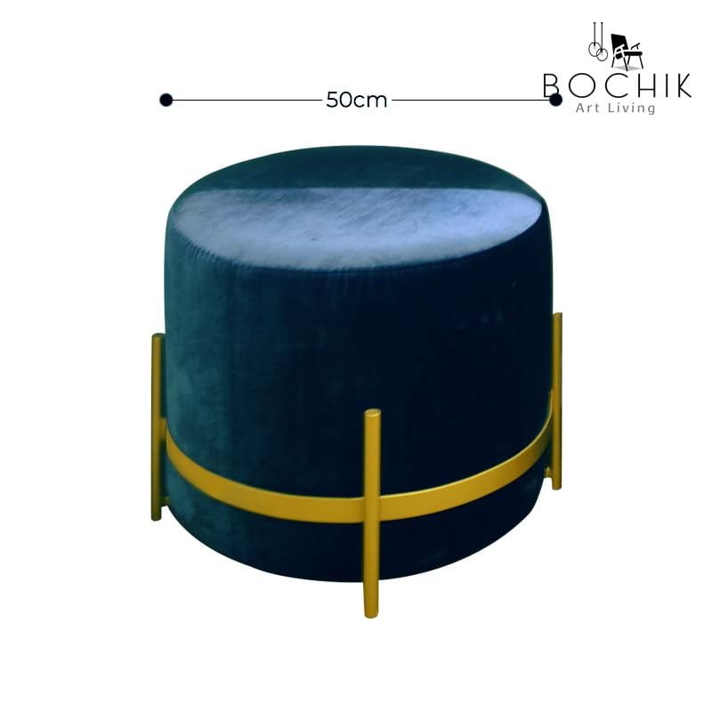 Tabouret Rond tapissé en velours bleu avec socle en métal doré.