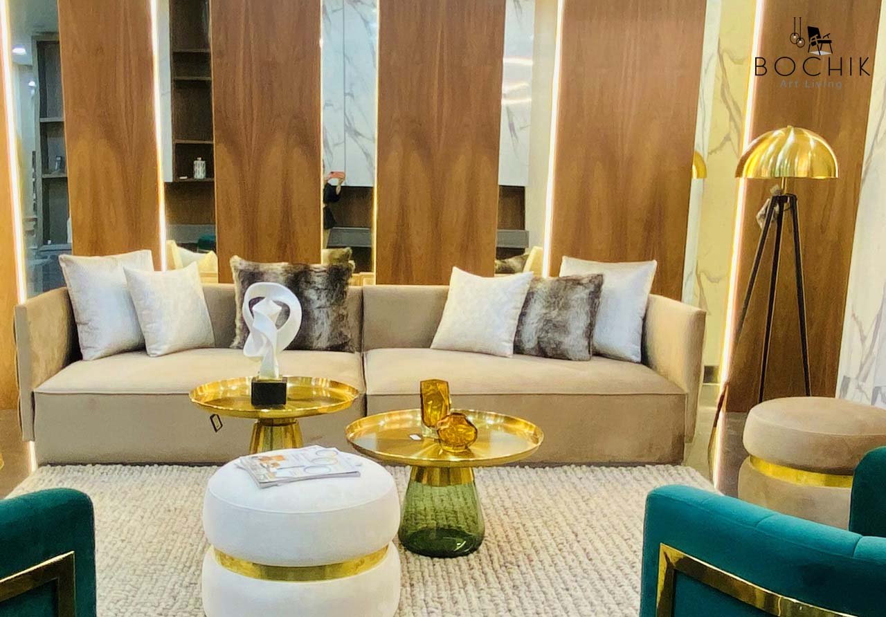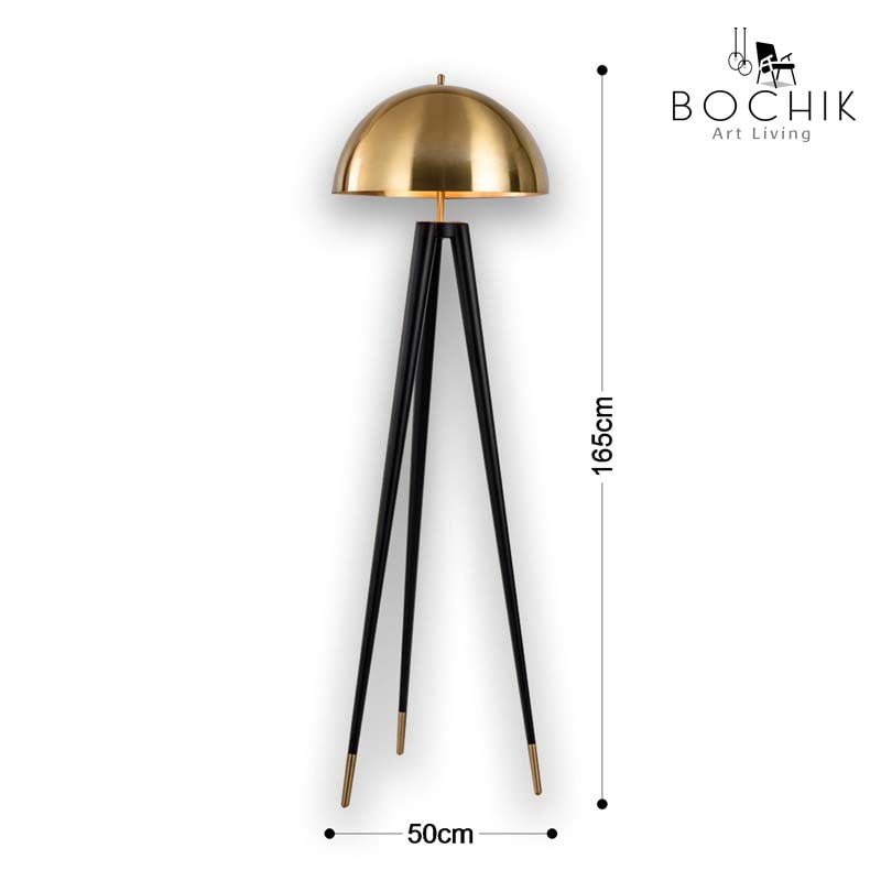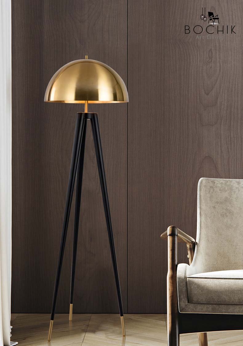 Lampadaire ICON Bis style cloche en acier inoxydable couleur OR & piétement noir. Découverez plus de détails sur Bochik Art Living.