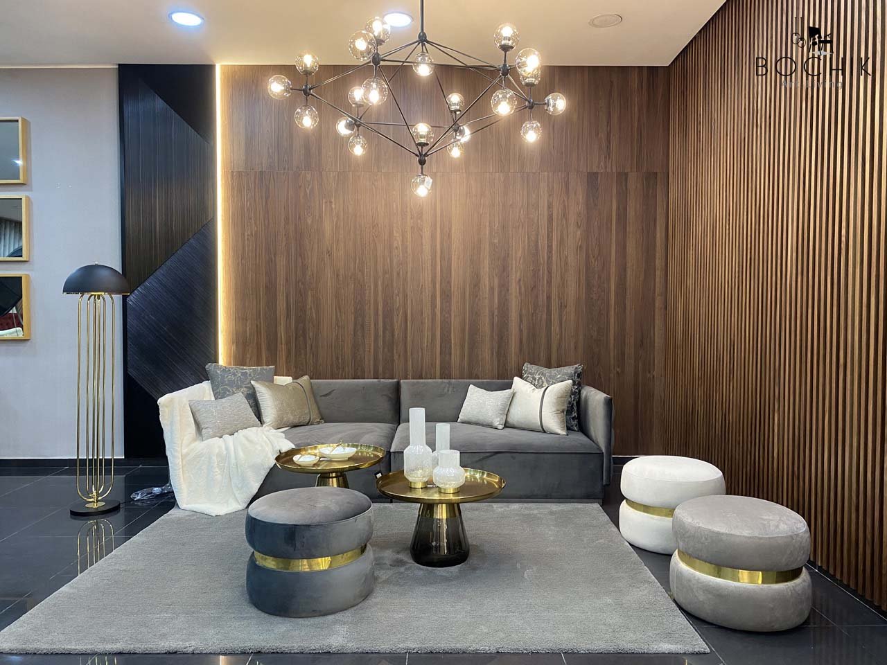 Lampadaire chic et tendance en acier inoxydable couleur or et dessus en acrylique couleur noir