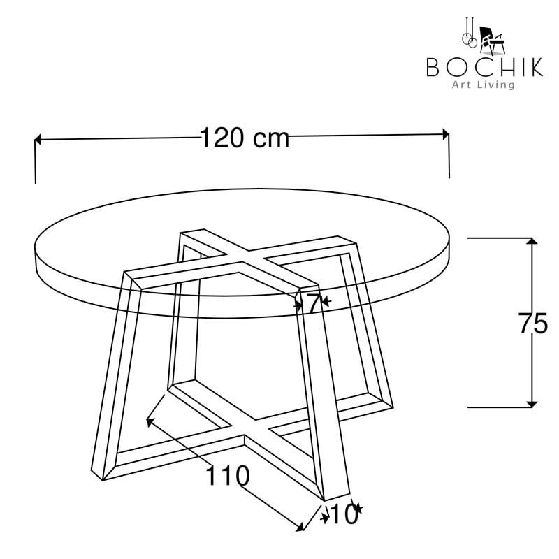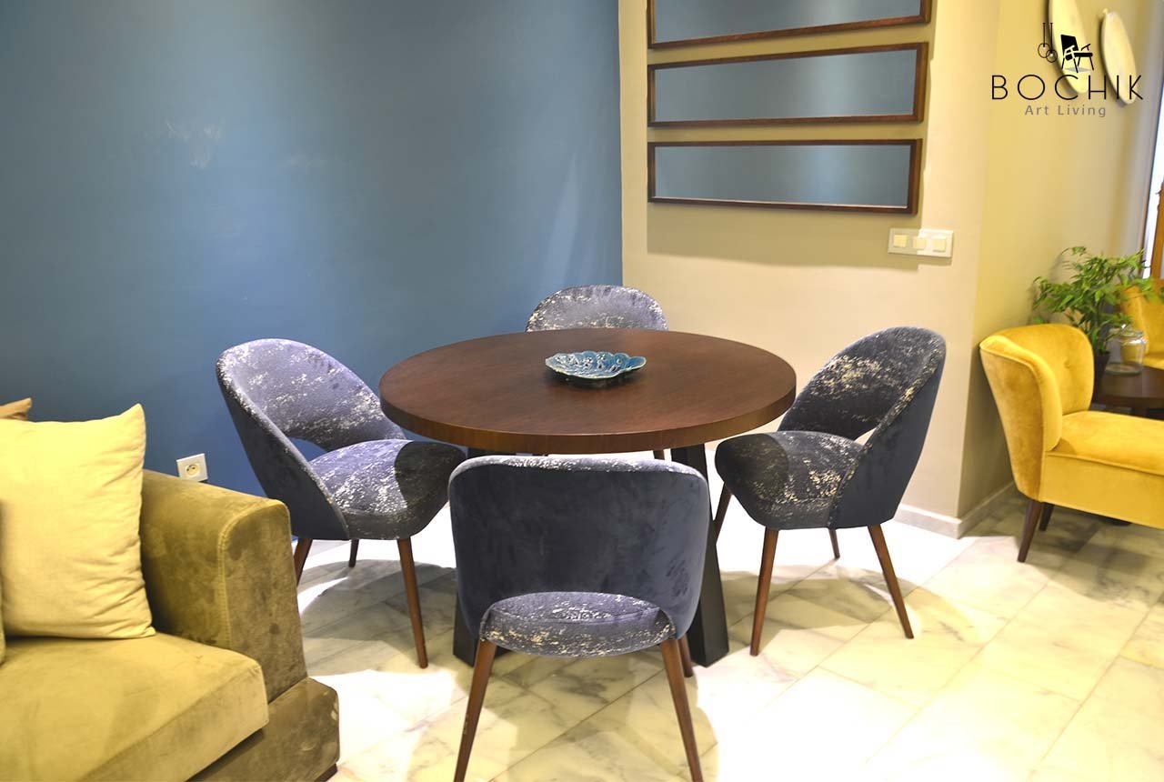 Table à manger en bois hêtre vernis noyer avec piétement en bois hêtre laqué noir.