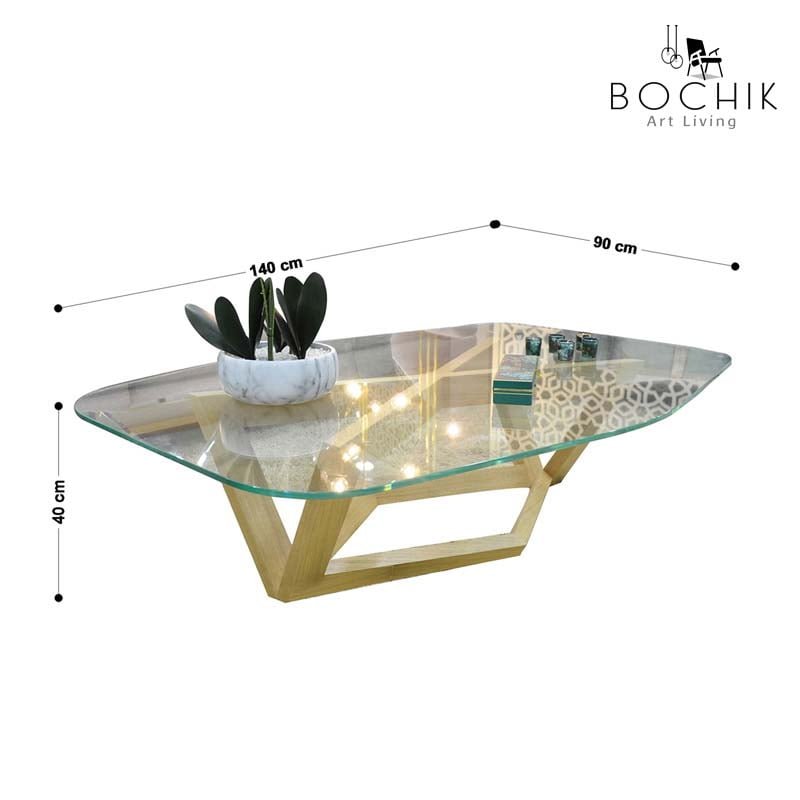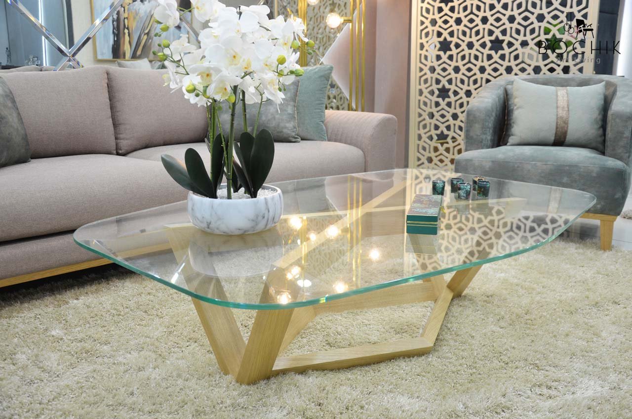 Table basse avec piétement en bois chêne et plateau en verre trempé clair de 12mm