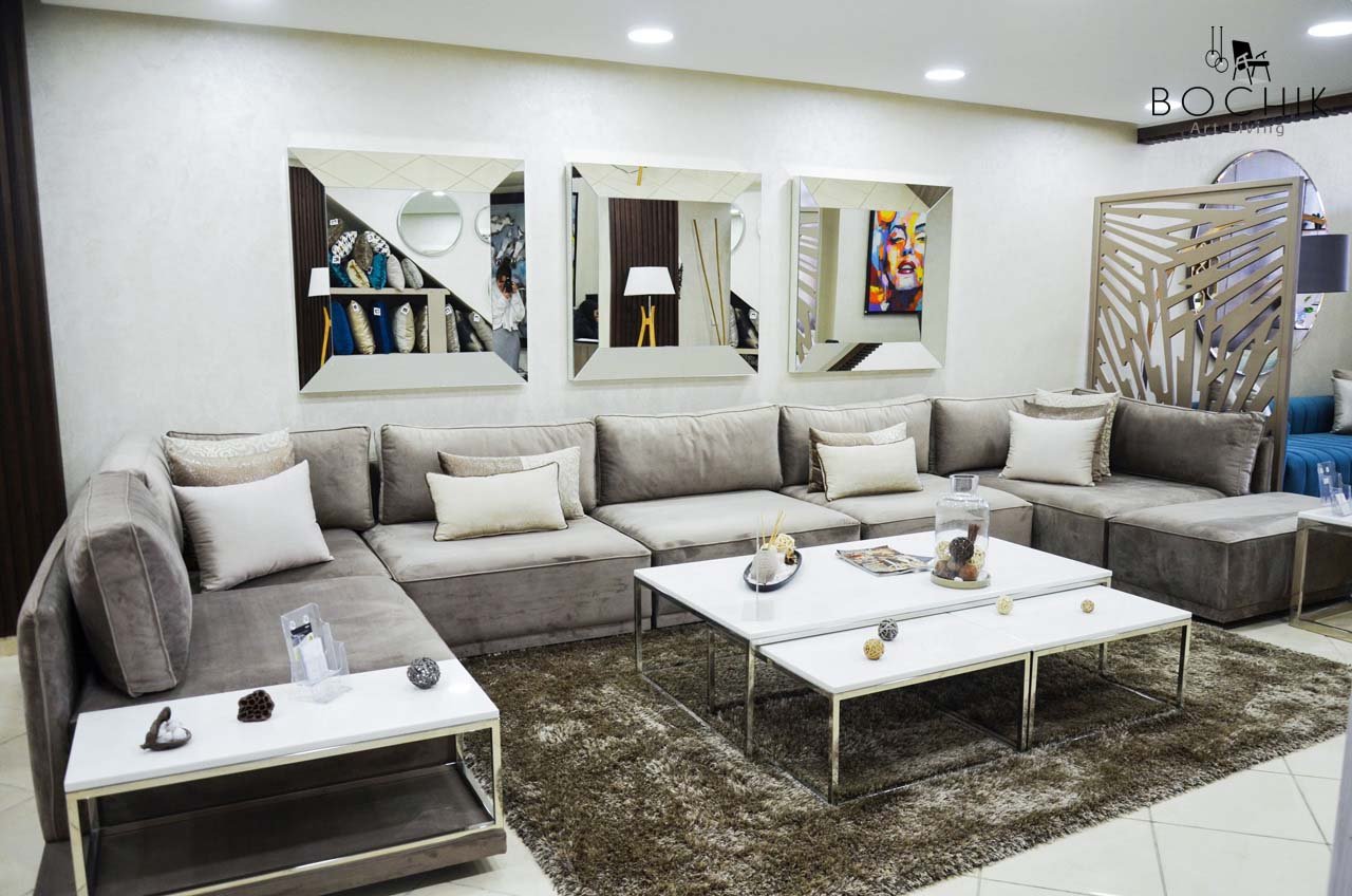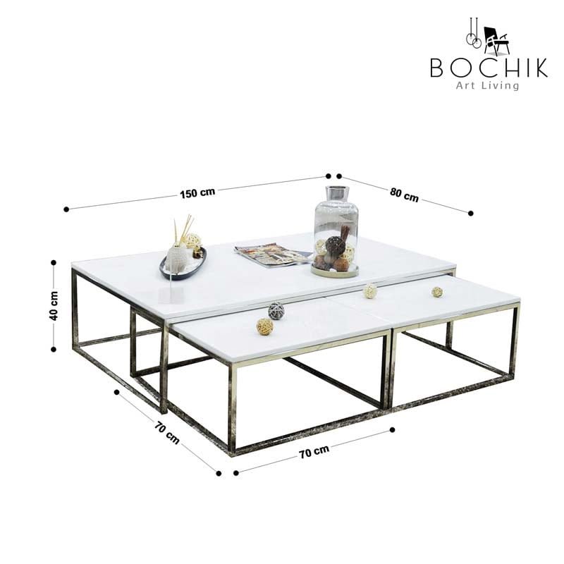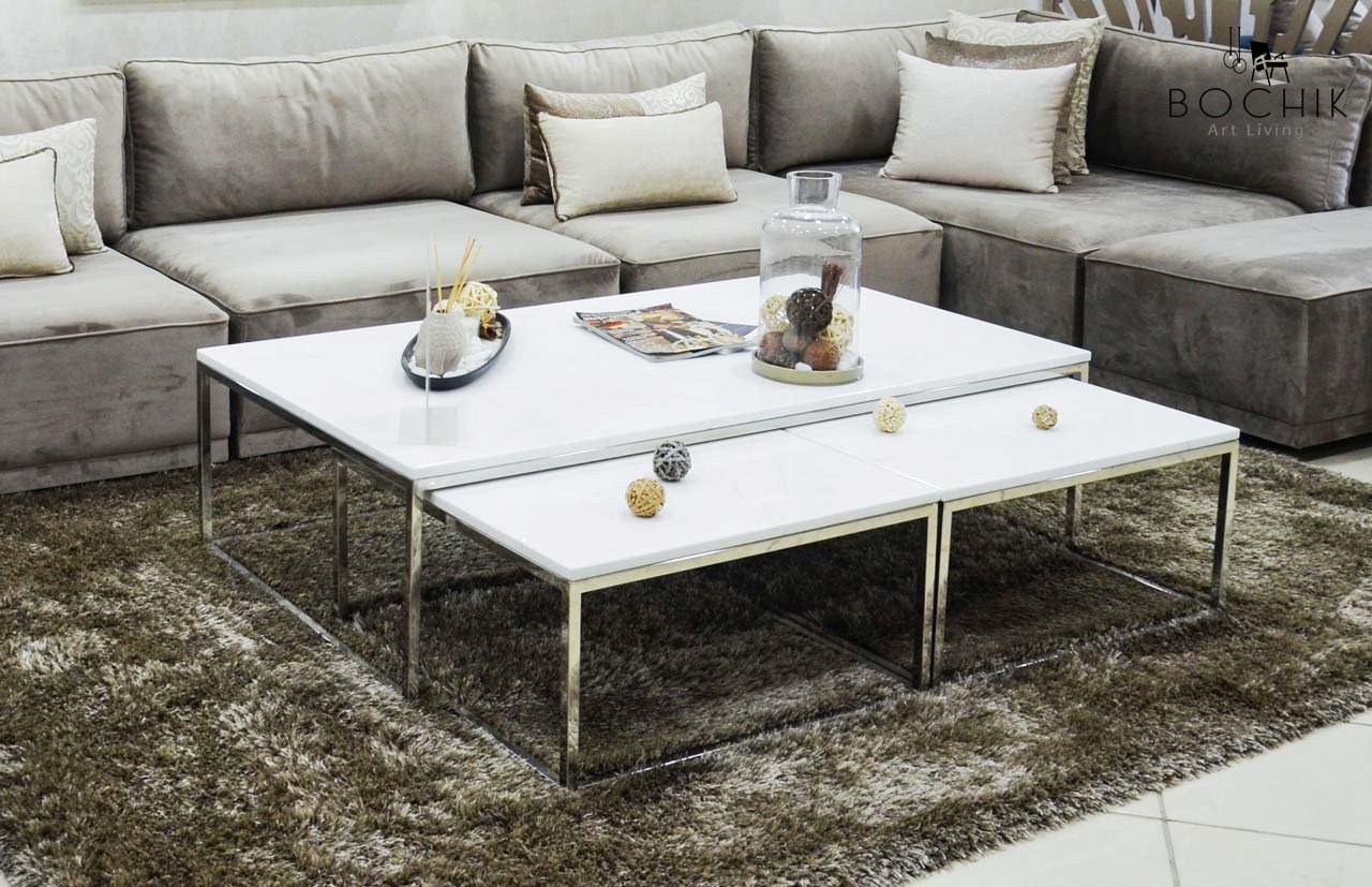 Ensemble de Table basse et 2 tables d’appoints avec plateau en marbre blanc Ibiza et piétement en inox polis