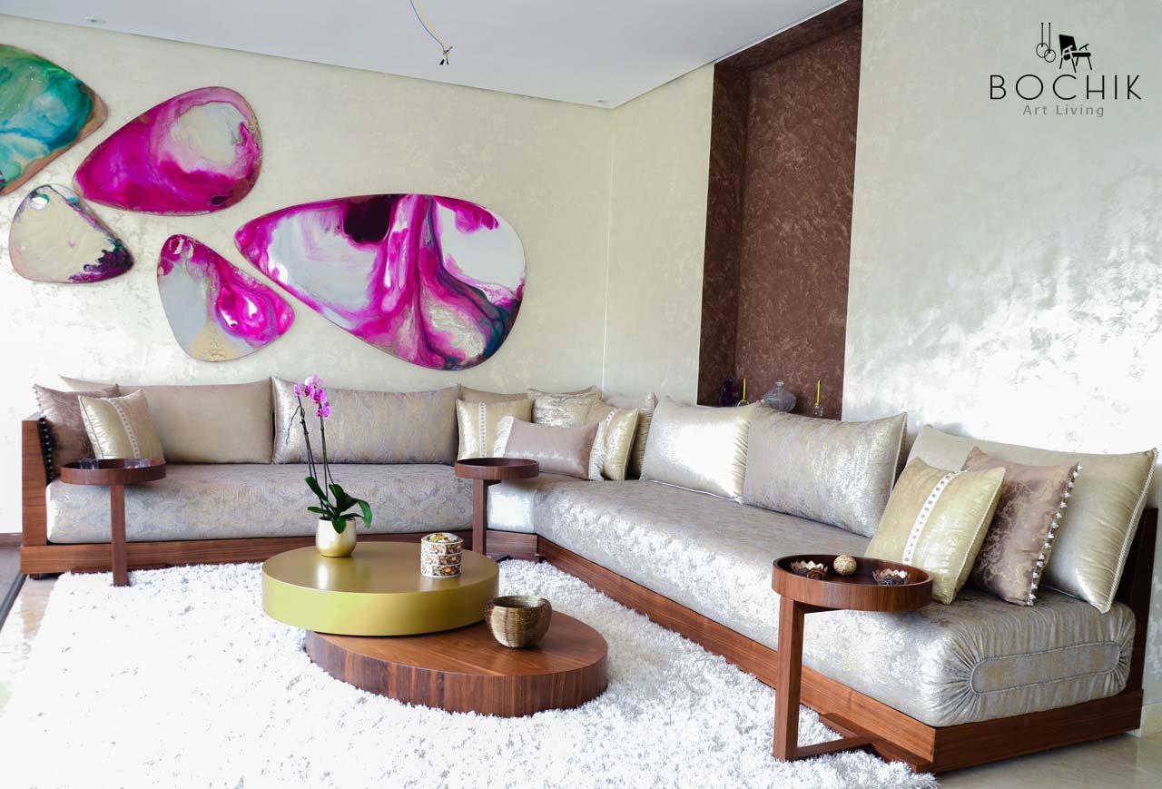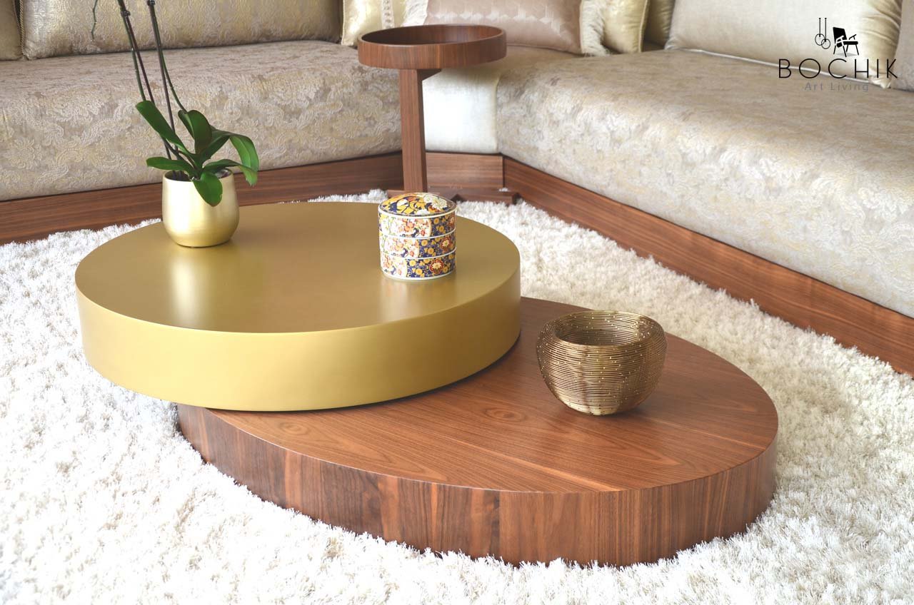 Table basse ovale en bois noyer et laqué Or, idéal pour salon marocain ou moderne