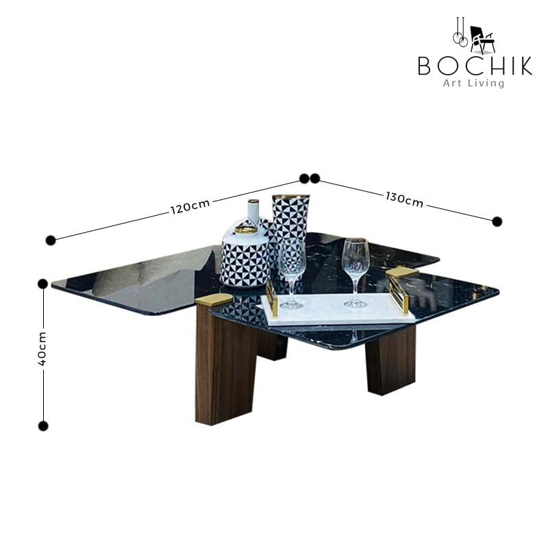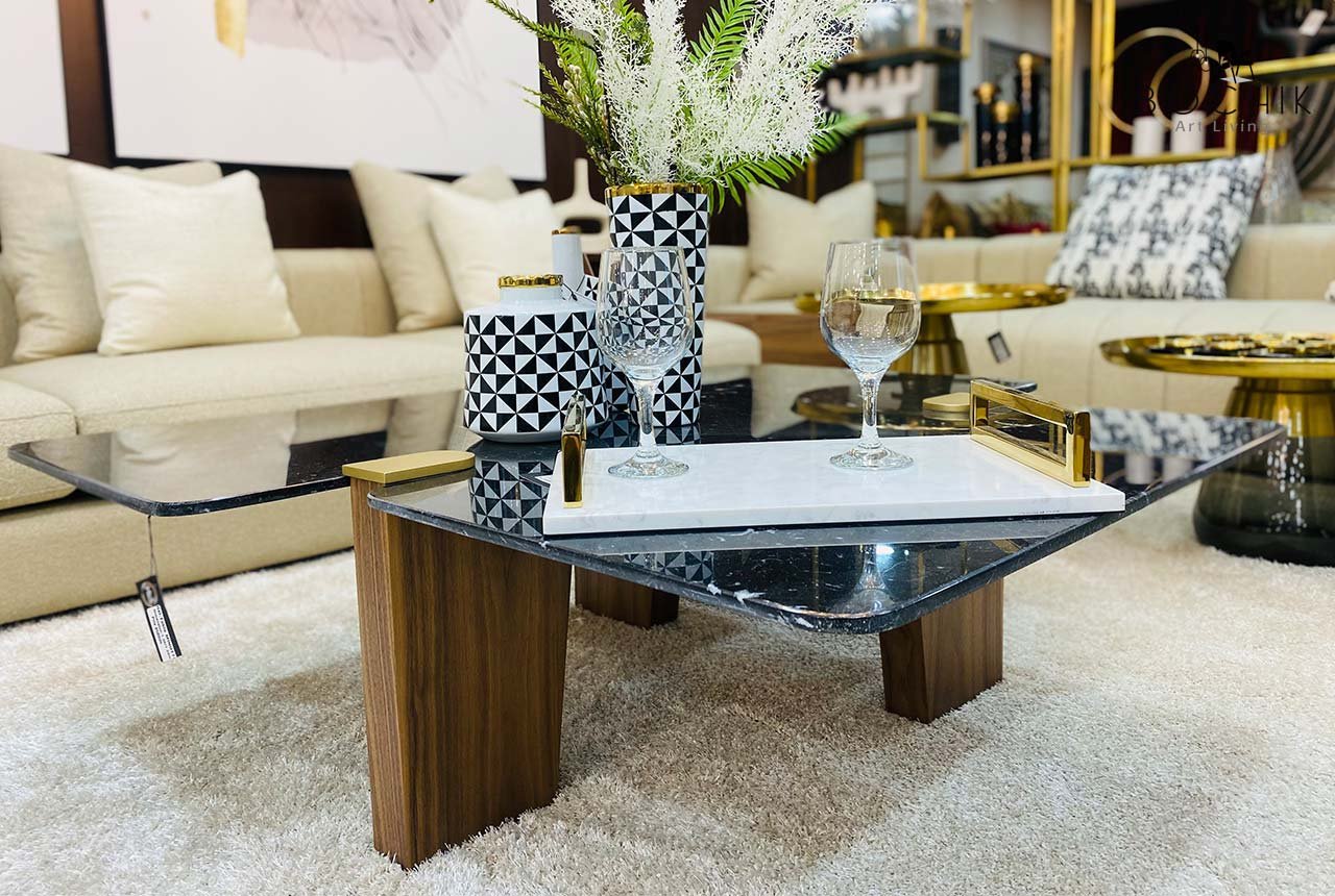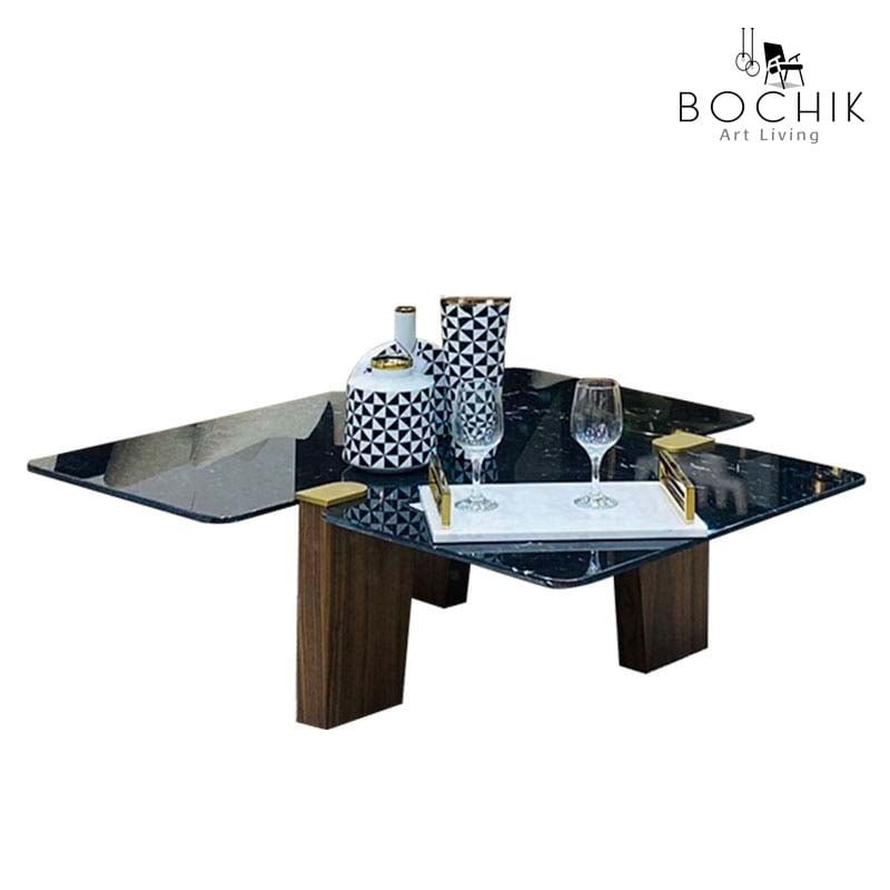 Table basse avec plateau en marbre noir et piètement en bois noyer .