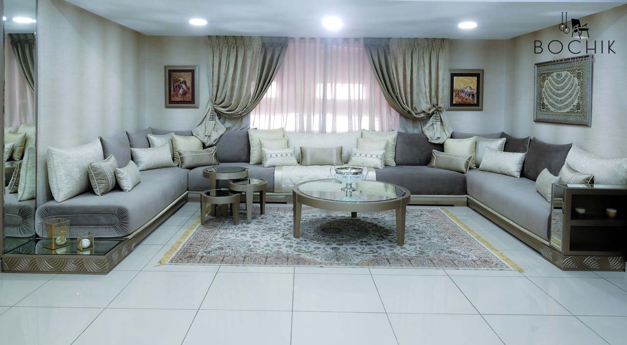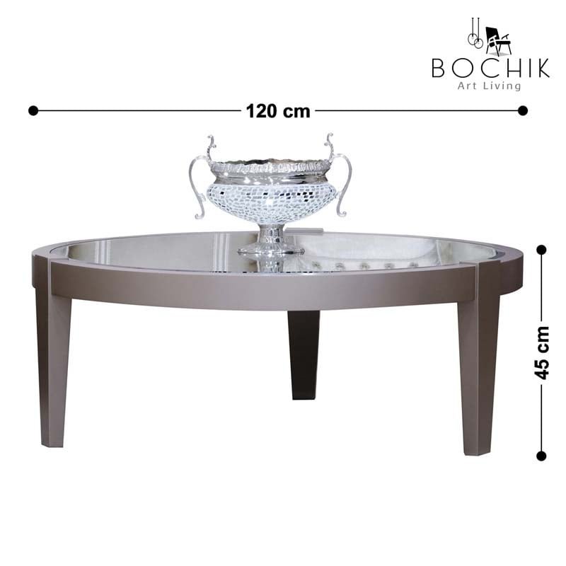 Table centrale en bois hêtre massif laqué bronze et plateau en miroir clair, idéal pour salon marocain et moderne
