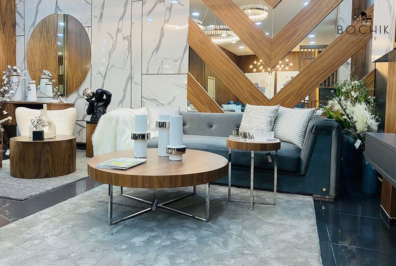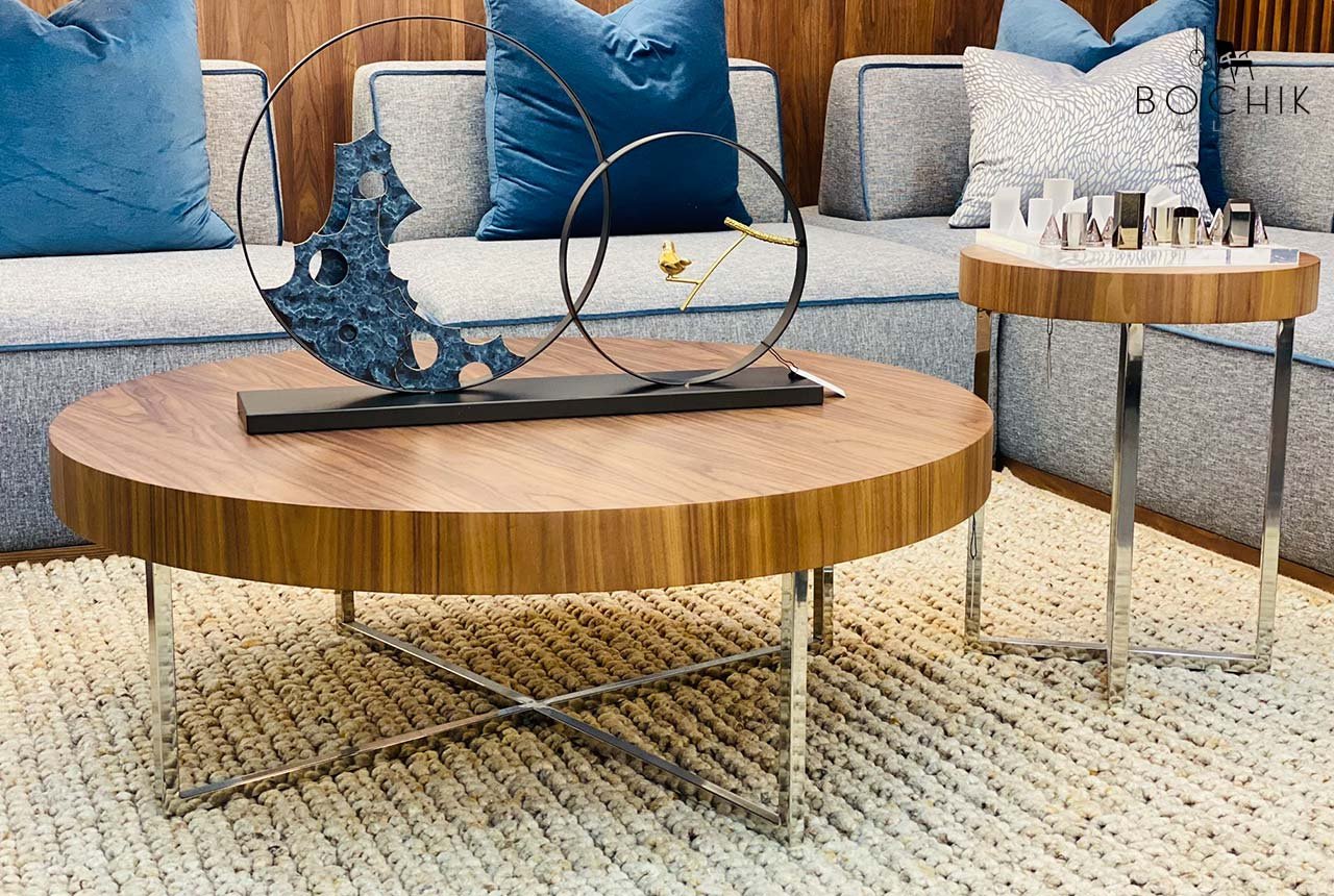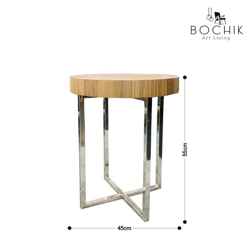 Table d’appoint avec plateau en bois vernis noyer et piètement en acier inoxydable couleur chrome.
