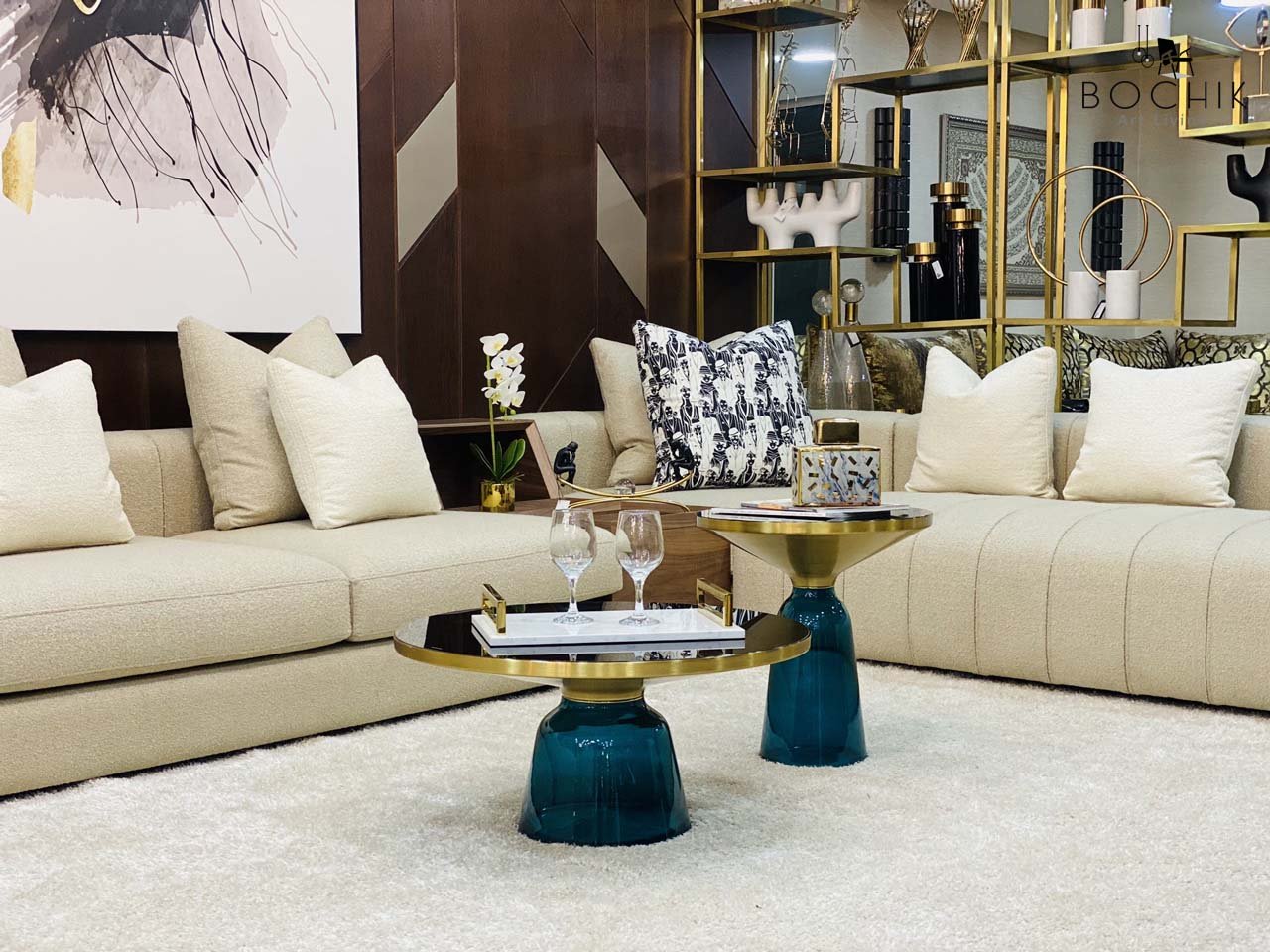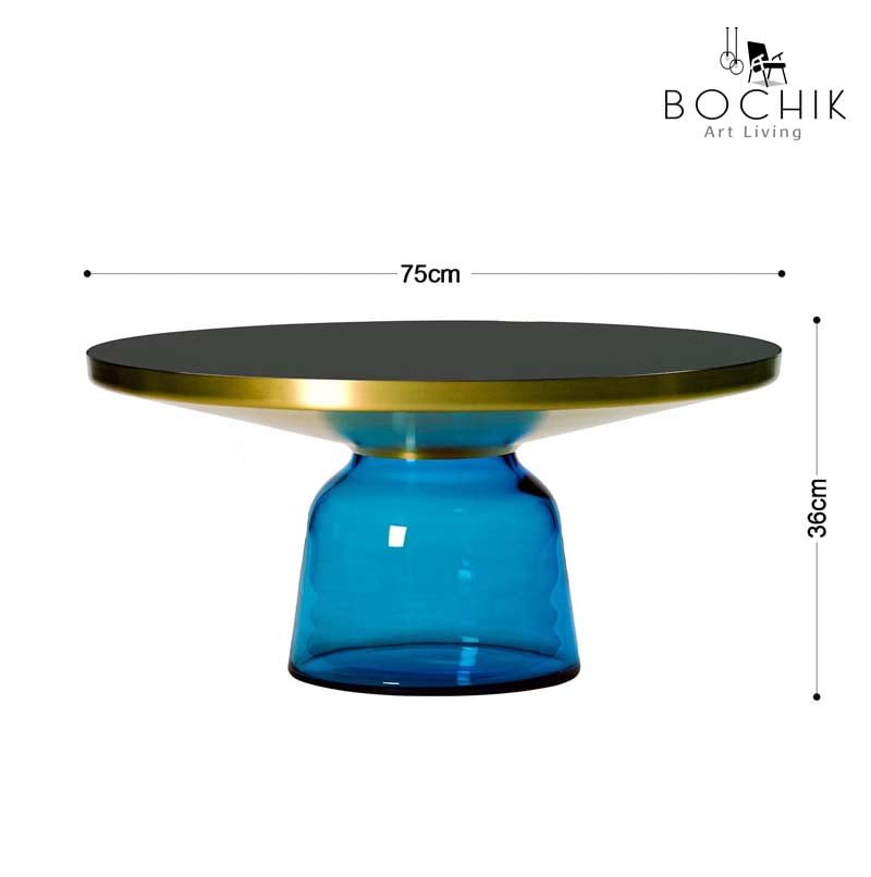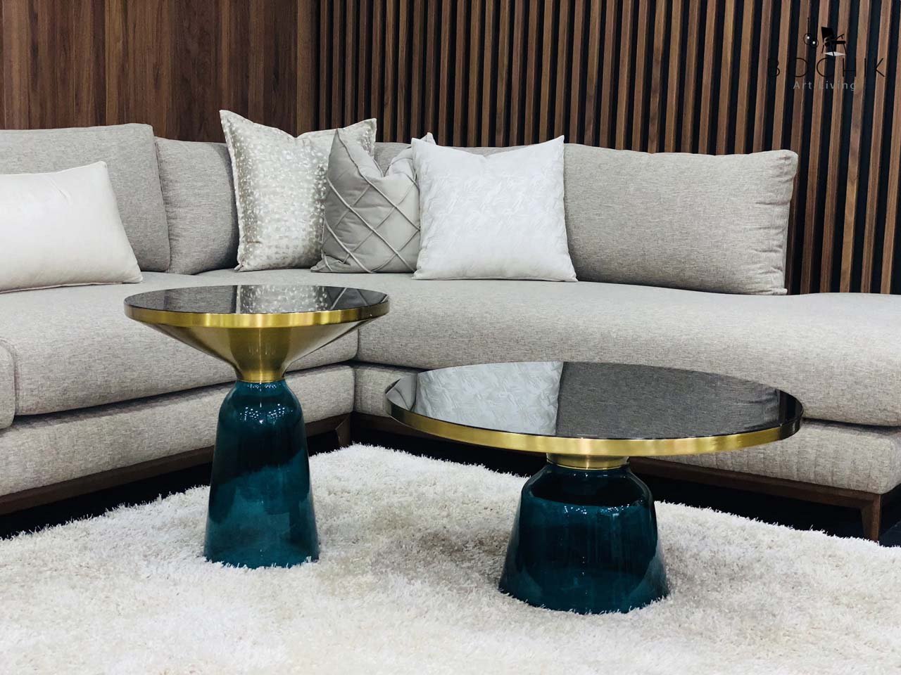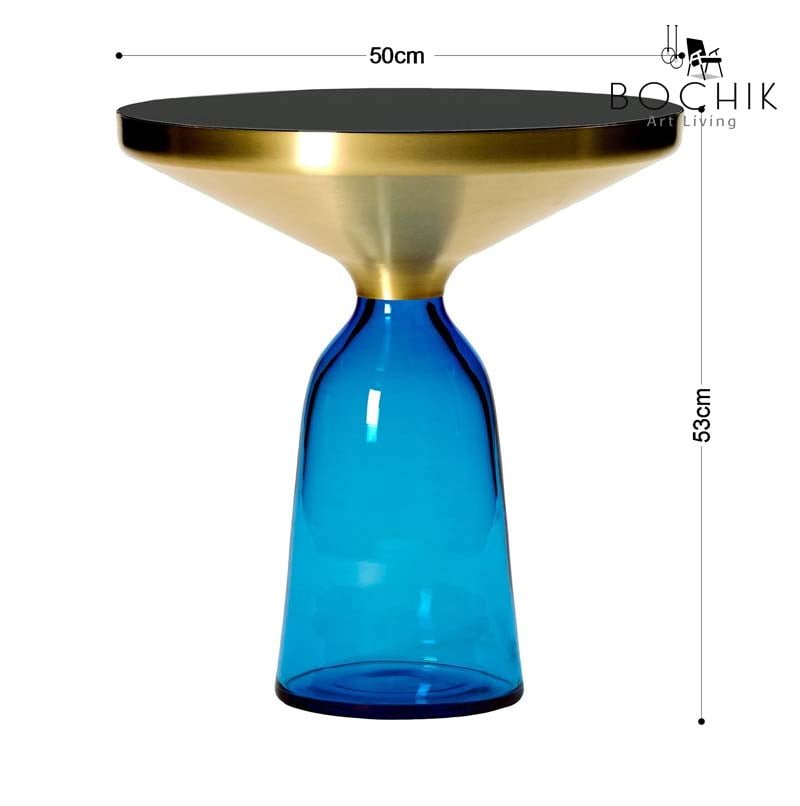 Ensemble de Tables basse Bell design en verre trempé Bleu, Dessus en Acier Inoxydable Couleur Or et plateau en verre noir.