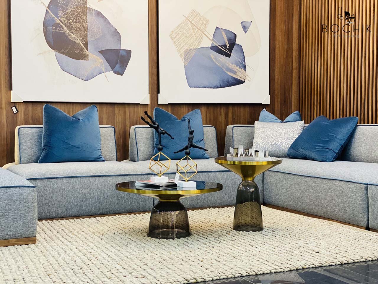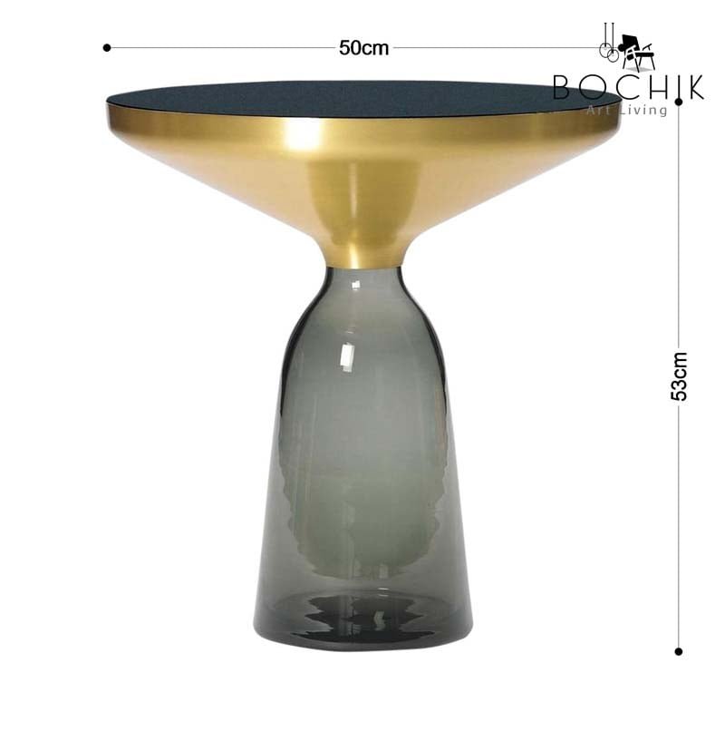 Ensemble de Tables basse design en verre trempé Gris, Dessus en Acier Inoxydable Couleur Or et plateau en verre noir.