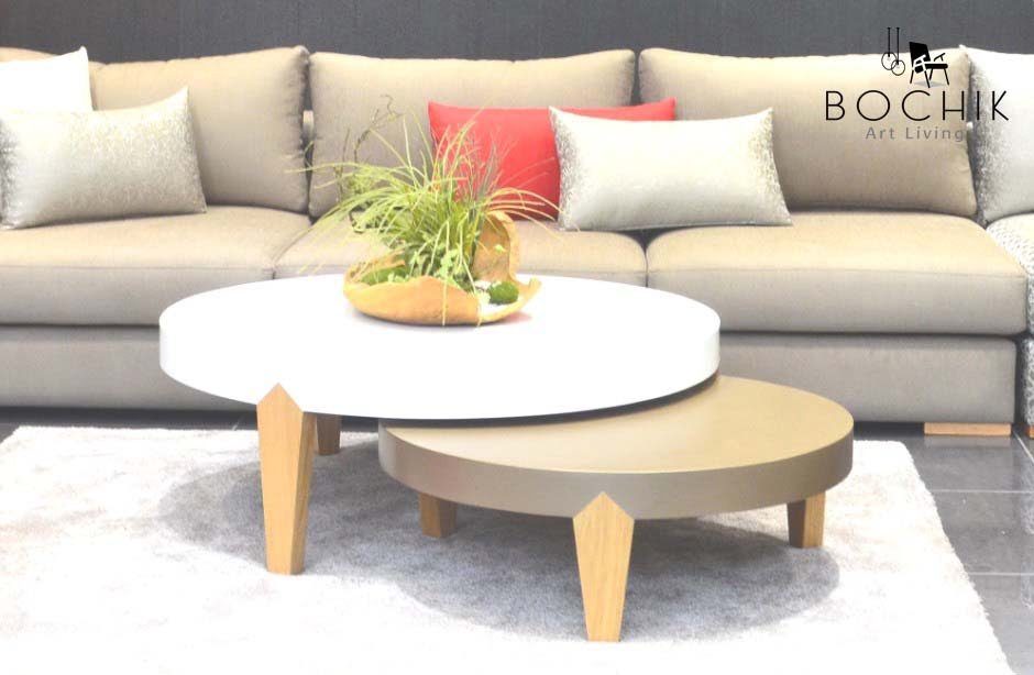 Ensemble de tables basses Darly en laqué blanc et bronze avec piètement en chêne.