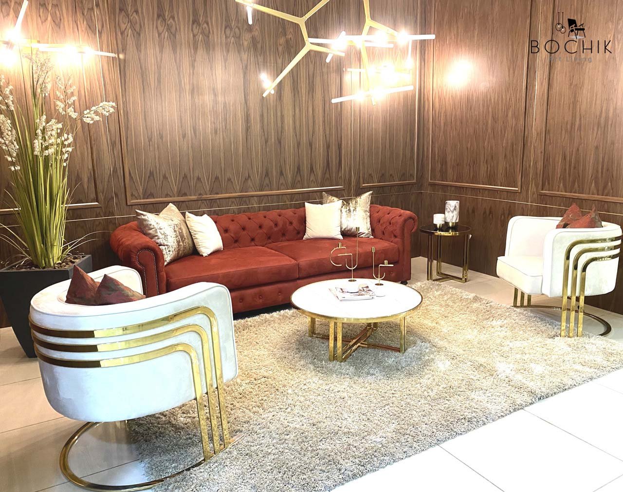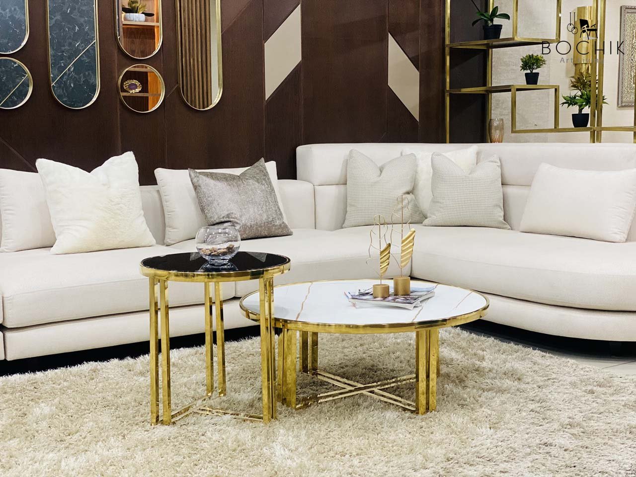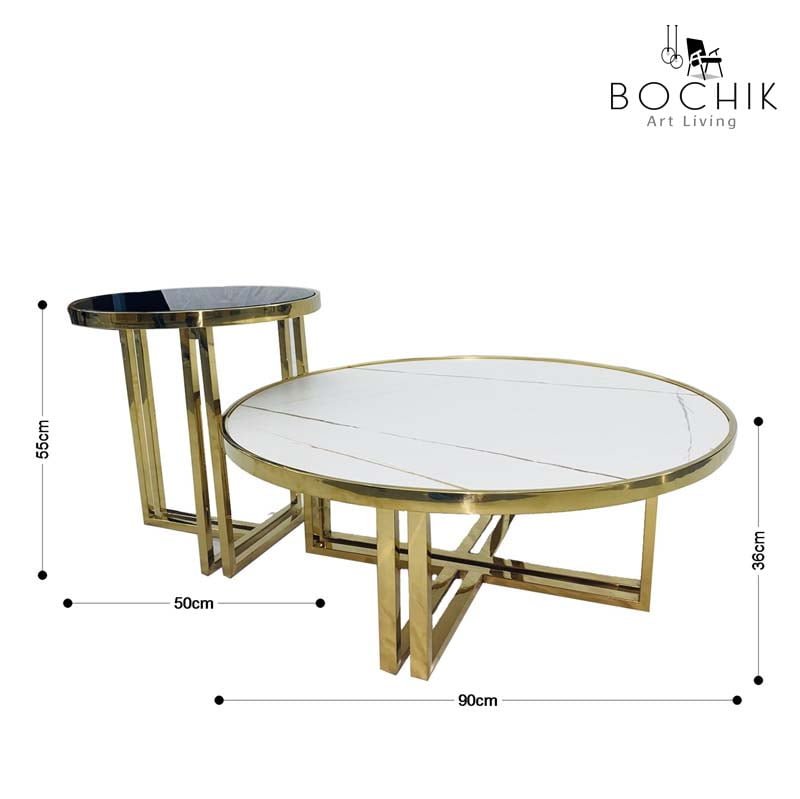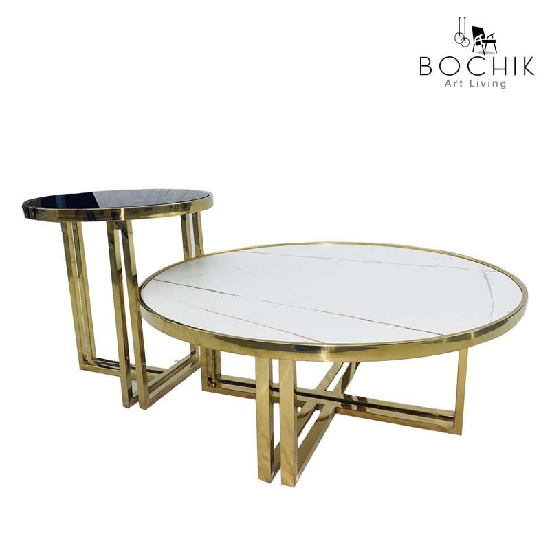 Ensemble de Tables basse avec piétement en Acier Inoxydable Couleur Or et plateau en Céramique couleur blanche et plateau en verre trempé noir