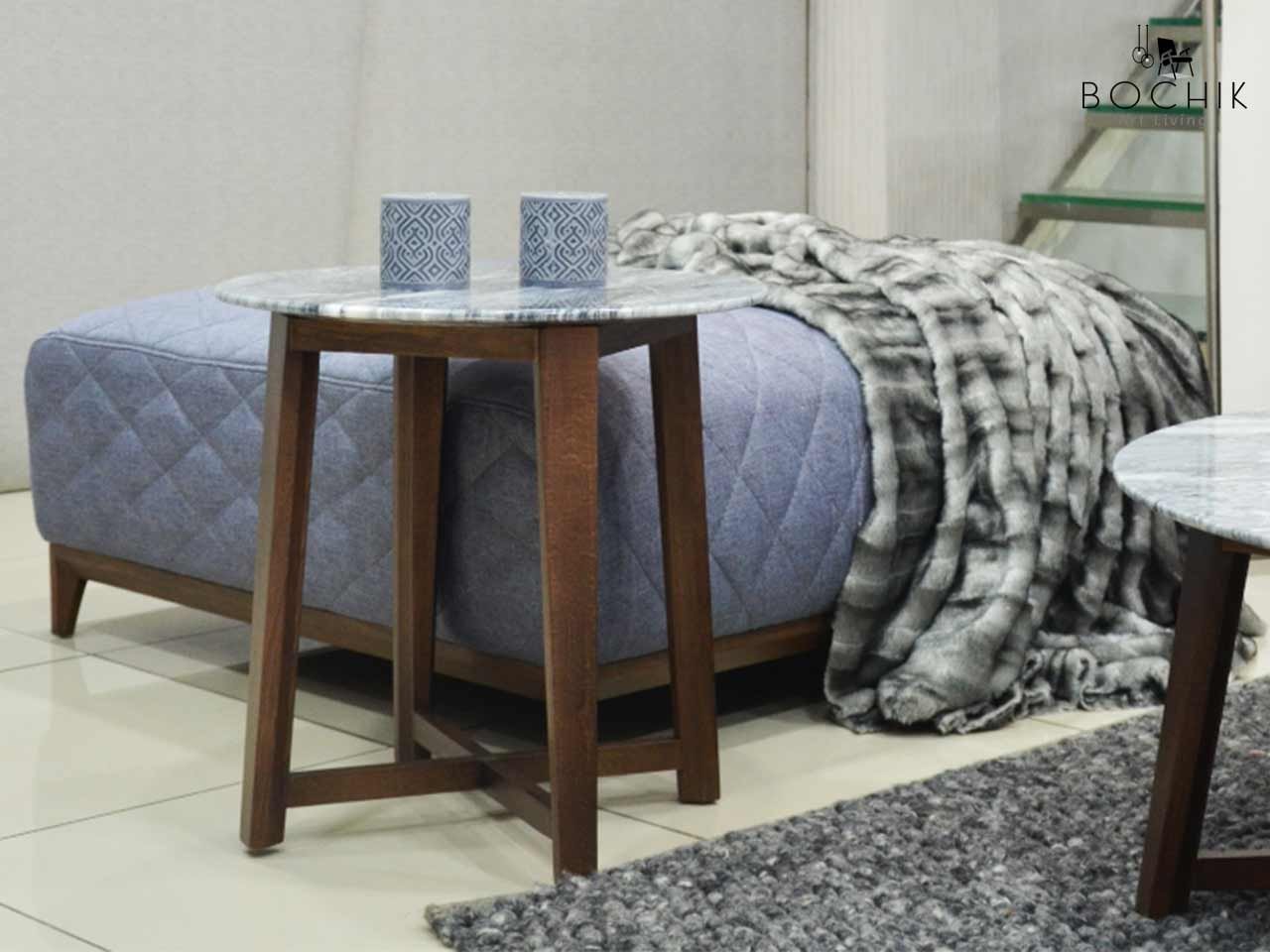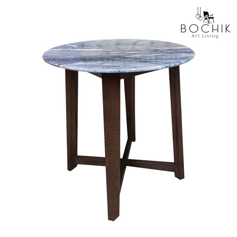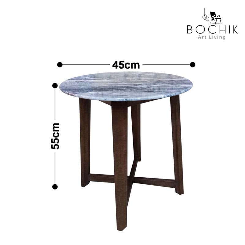 Table d’appoint en marbre blanc Ibiza et piétement en bois hêtre massif vernis noyer